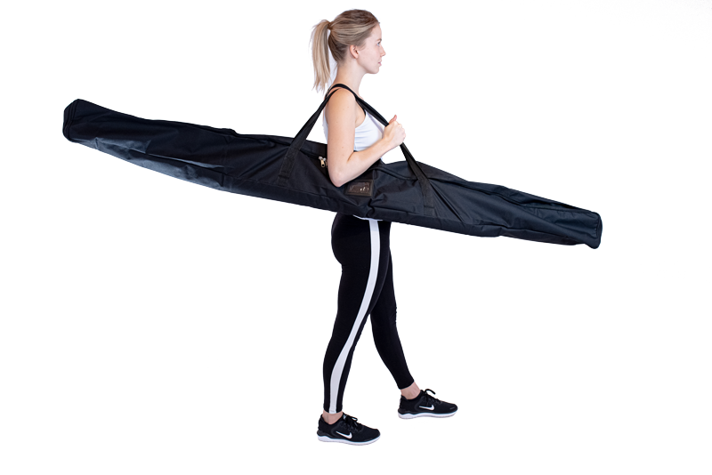 Das Komplett-Set enthält den Fahnenmast Event Beachflag, das Drehkreuz DK820 Beachflag, die Drehlager-Mastaufnahme, einen Wasserschlauch zur Beschwerung und eine Transporttasche.